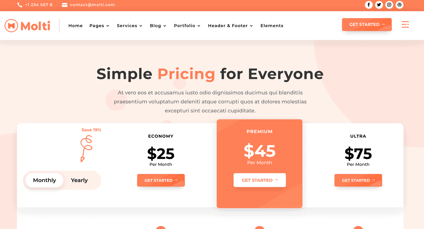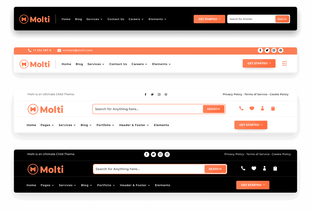 With many Theme Builder Templates Molti also Provides 6 Cool Header Designs for any kind of website, simply choose a design that suits you and make it yours.