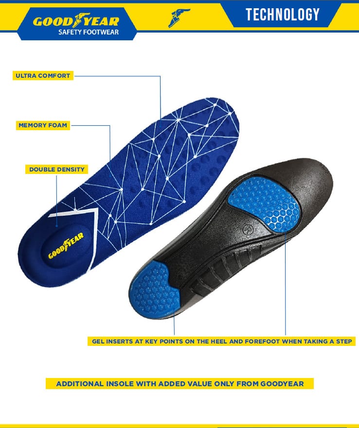 Goodyear’s advanced insole technology is engineered for all-day performance and fatigue-fighting comfort. Featuring a double-density memory foam structure, it delivers ultra-soft cushioning that adapts to your foot’s shape with every step. Strategic gel inserts at the heel and forefoot absorb impact where it hits hardest, reducing strain on long shifts. And for added value, each pair of Goodyear safety boots comes with an extra insole—so you’re always ready to refresh your step when needed.